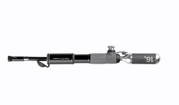 Hochdruck-Rennradpumpe bis 11 bar. CO2- oder Handbetrieb per ausziehbarem Schlauch.